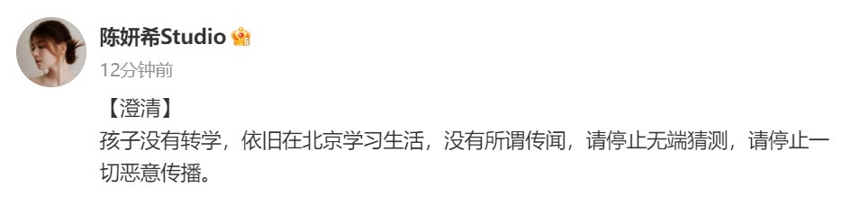 2月25日,陈妍希工作室@陈妍希Studio 发文:孩子没有转学,依旧在北京学习生活,没有所谓传闻,请停止无端猜测,请停止一切恶意传播。